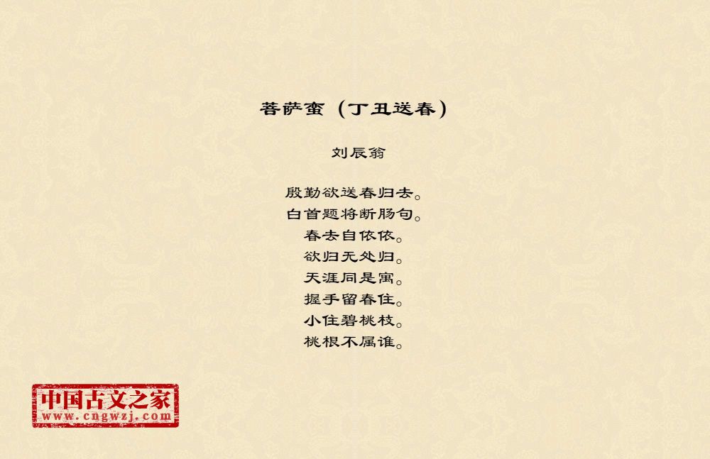 殷勤欲送春归去。白首题将断肠句。春去自依依。欲归无处归。天涯同是寓。握手留春住。小住碧桃枝。桃根不属谁。