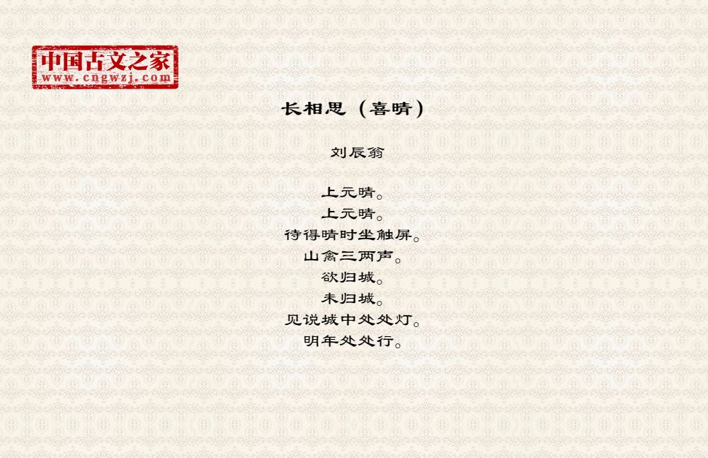 上元晴。上元晴。待得晴时坐触屏。山禽三两声。欲归城。未归城。见说城中处处灯。明年处处行。