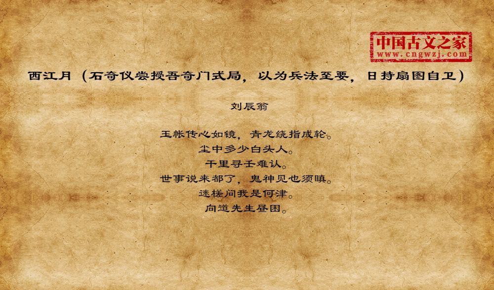 《西江月(石奇仪尝授吾奇门式局,以为兵法至要,日持扇图自卫)》由刘辰翁创作