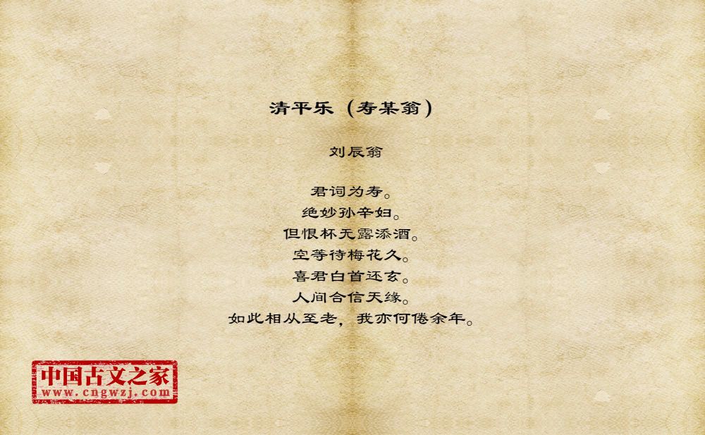 君词为寿。绝妙孙辛妇。但恨杯无露添酒。空等待梅花久。喜君白首还玄。人间合信天缘。如此相从至老,我亦何倦余年。