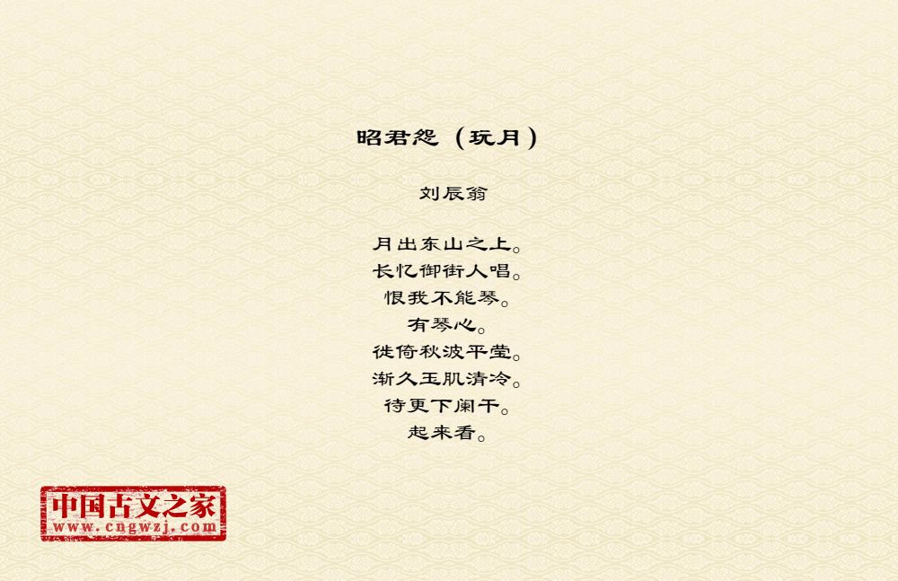 月出东山之上。长忆御街人唱。恨我不能琴。有琴心。徙倚秋波平莹。渐久玉肌清冷。待更下阑干。起来看。