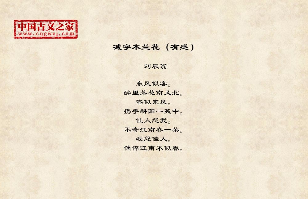 东风似客。醉里落花南又北。客似东风。携手斜阳一笑中。佳人怨我。不寄江南春一朵。我怨佳人。憔悴江南不似春。