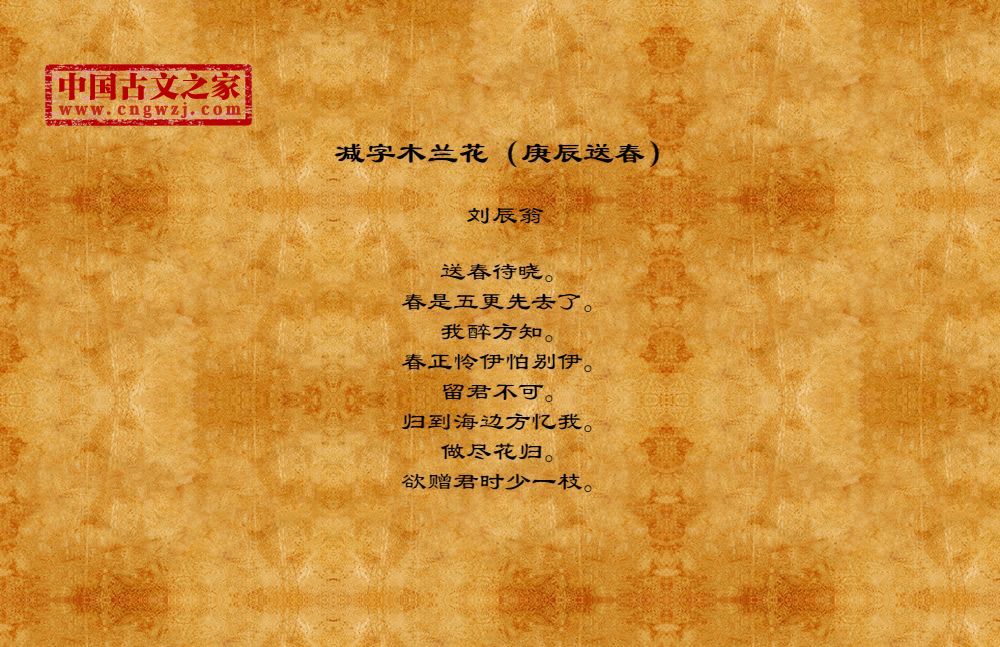 送春待晓。春是五更先去了。我醉方知。春正怜伊怕别伊。留君不可。归到海边方忆我。做尽花归。欲赠君时少一枝。