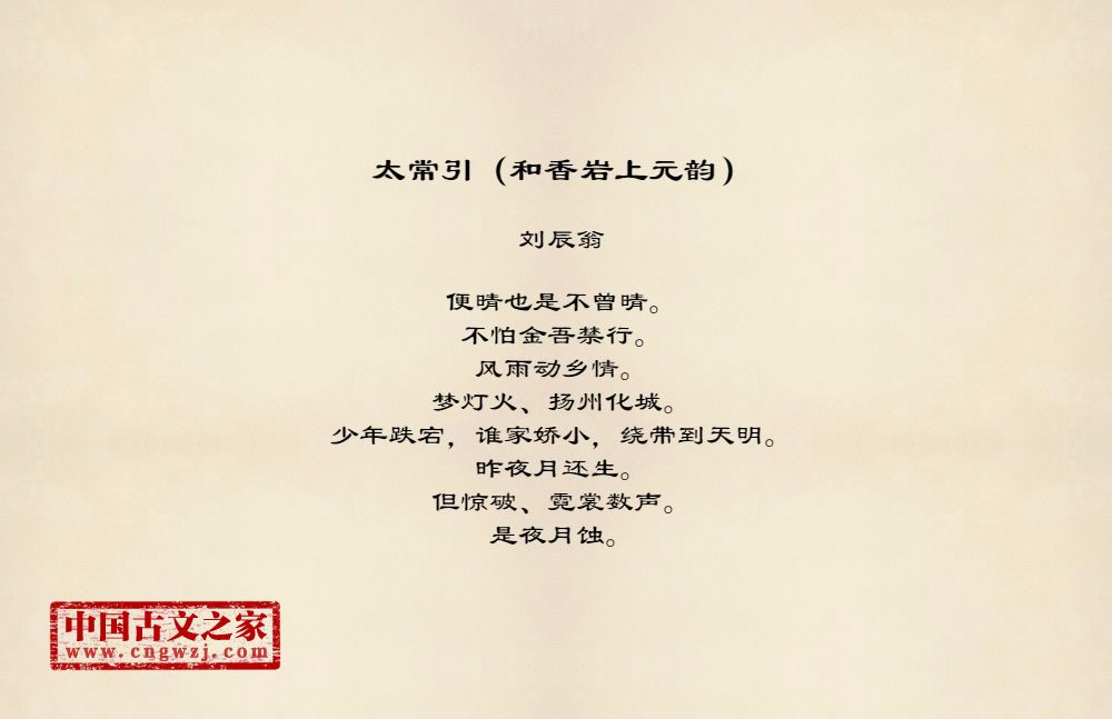 便晴也是不曾晴。不怕金吾禁行。风雨动乡情。梦灯火、扬州化城。少年跌宕,谁家娇小,绕带到天明。昨夜月还生。但惊破、霓裳数声。是夜月蚀。