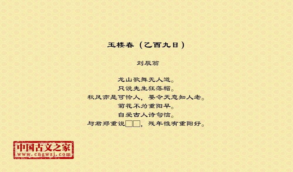 龙山歌舞无人道。只说先生狂落帽。秋风亦是可怜人,要令天意知人老。菊花不为重阳早。自爱古人诗句恼。与君郑重说□□,残年惟有重阳好。