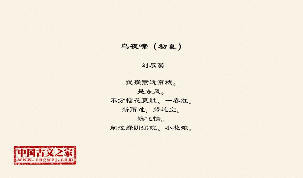 犹疑薰透帘栊。是东风。不分榴花更胜、一春红。新雨过,绿连空。蝶飞慵。闲过绿阴深院、小花浓。