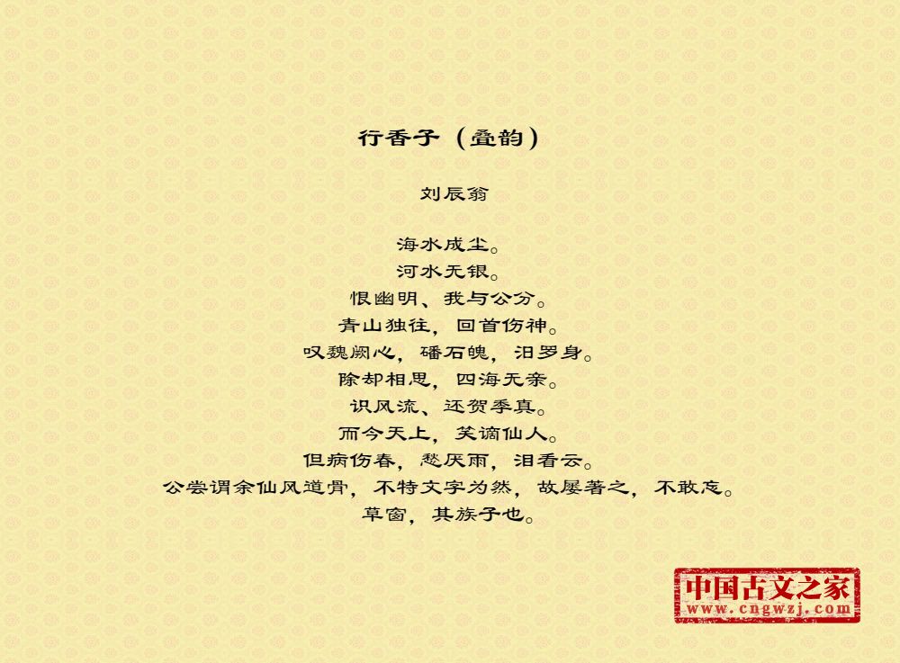 海水成尘。河水无银。恨幽明、我与公分。青山独往,回首伤神。叹魏阙心,磻石魄,汨罗身。除却相思,四海无亲。识风流、还贺季真。而今天上,笑谪仙人。但病伤春,愁厌雨,泪看云。公尝谓余仙风道骨,不特文字为然,故屡著之,不敢忘。草窗,其族子也。