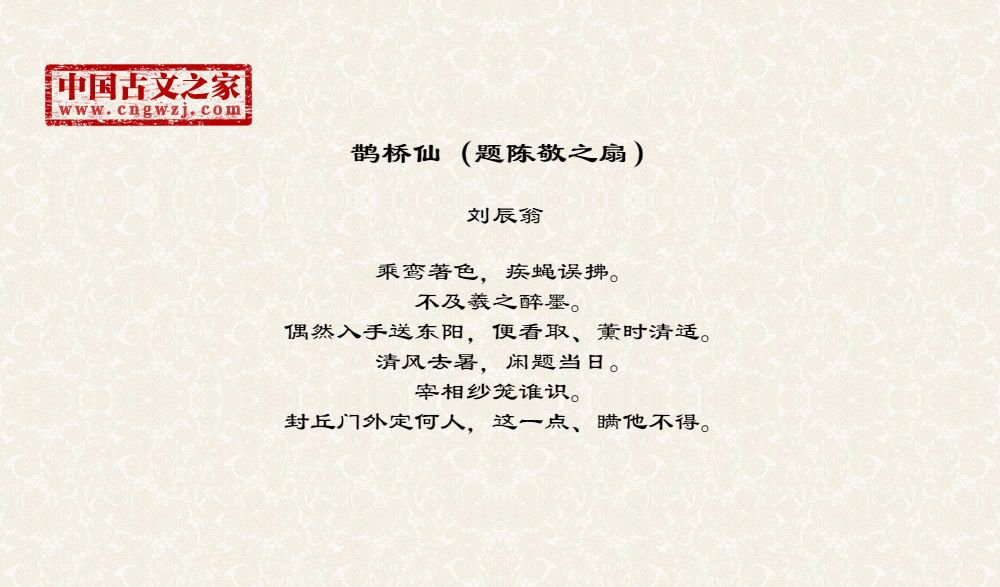 乘鸾著色,疾蝇误拂。不及羲之醉墨。偶然入手送东阳,便看取、薰时清适。清风去暑,闲题当日。宰相纱笼谁识。封丘门外定何人,这一点、瞒他不得。