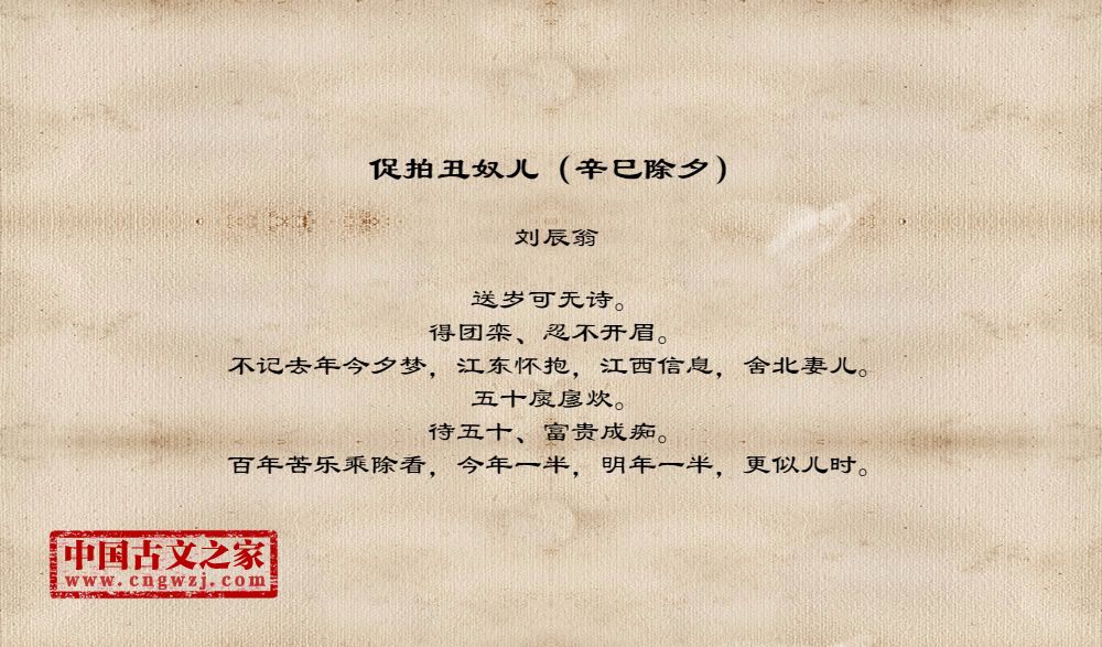 送岁可无诗。得团栾、忍不开眉。不记去年今夕梦,江东怀抱,江西信息,舍北妻儿。五十扊扅炊。待五十、富贵成痴。百年苦乐乘除看,今年一半,明年一半,更似儿时。