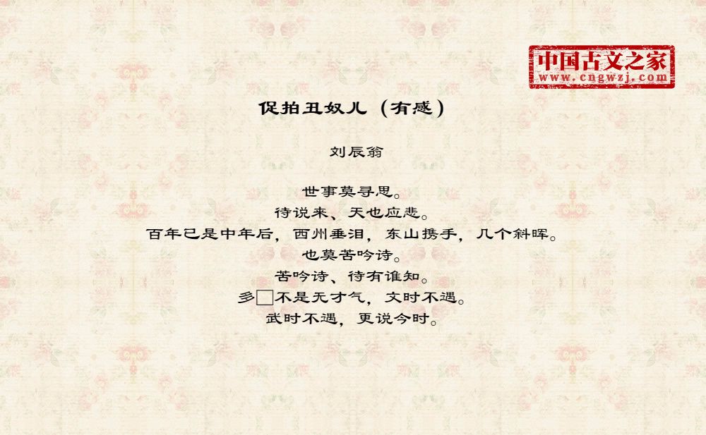 世事莫寻思。待说来、天也应悲。百年已是中年后,西州垂泪,东山携手,几个斜晖。也莫苦吟诗。苦吟诗、待有谁知。多□不是无才气,文时不遇。武时不遇,更说今时。