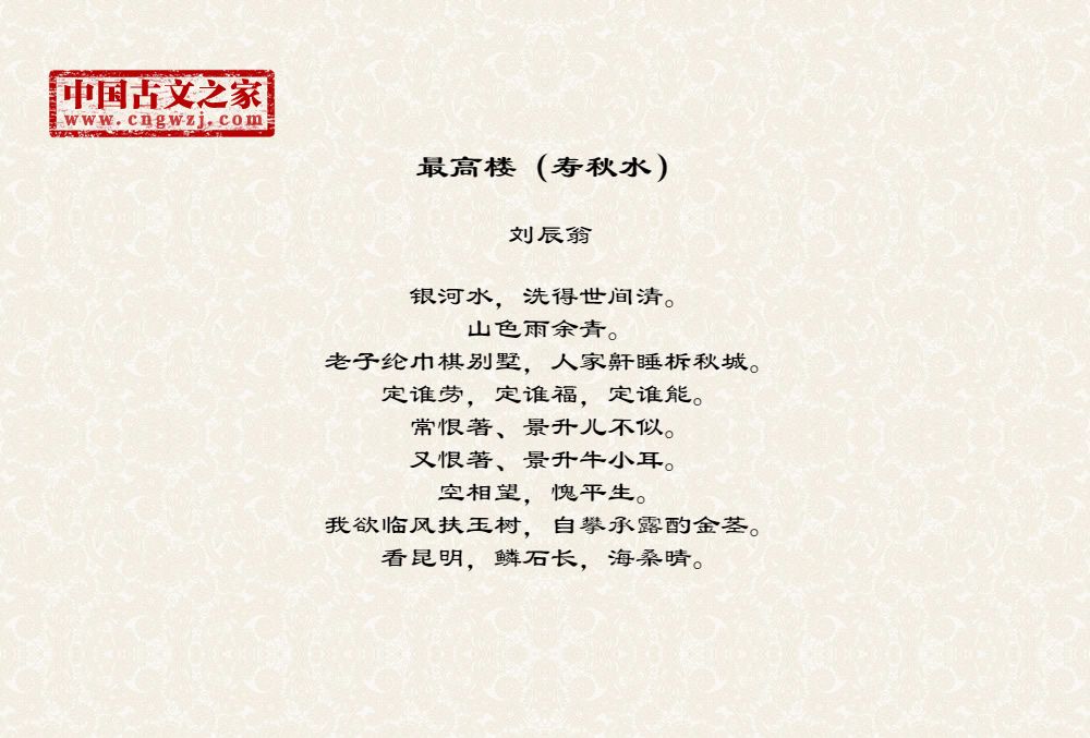 银河水,洗得世间清。山色雨余青。老子纶巾棋别墅,人家鼾睡柝秋城。定谁劳,定谁福,定谁能。常恨著、景升儿不似。又恨著、景升牛小耳。空相望,愧平生。我欲临风扶玉树,自攀承露酌金茎。看昆明,鳞石长,海桑晴。