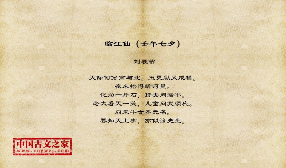 天际何分南与北,五更纵又成横。夜来拾得断河星。化为一片石,持去问君平。老大看天一笑,儿童问我须应。向来牛女本无名。要知天上事,亦似谤先生。