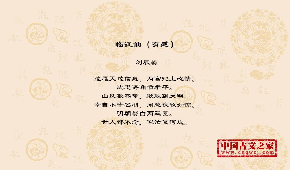 过雁天边信息,两宫池上心情。沈思海角愤难平。山风欺客梦,耿耿到天明。幸自不争名利,闲愁夜夜如惊。明朝鬓白两三茎。世人都不念,似汝复何成。