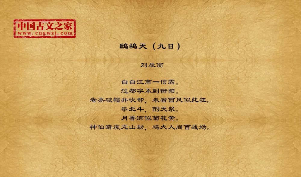 白白江南一信霜。过都字不到衡阳。老嘉破帽并吹却,未省西风似此狂。攀北斗,酌天浆。月香满似菊花黄。神仙暗度龙山劫,鸡犬人间百战场。
