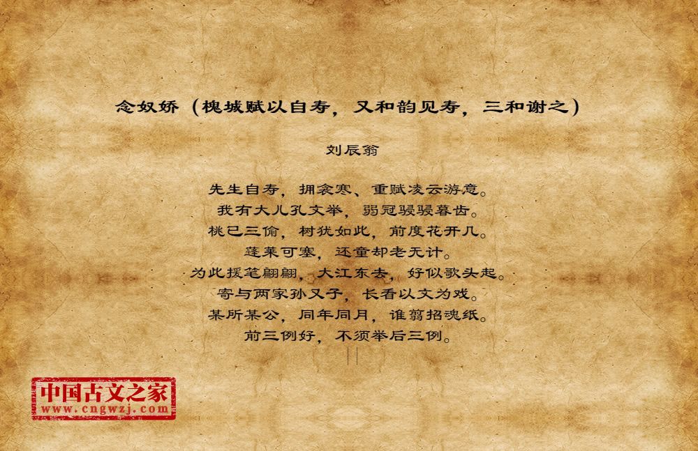 《念奴娇(槐城赋以自寿,又和韵见寿,三和谢之)》的原文打印版(刘辰翁)