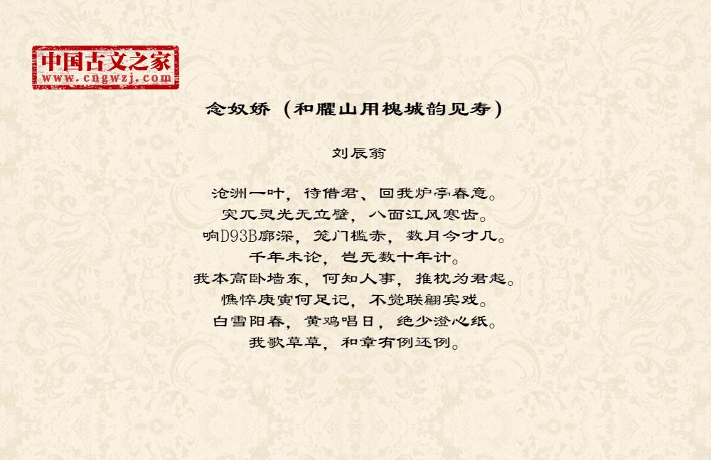 《念奴娇(和臞山用槐城韵见寿)》的原文打印版(刘辰翁)