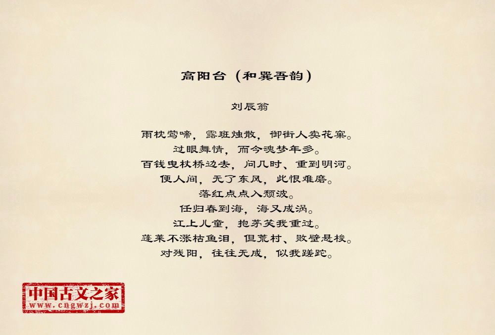 雨枕莺啼,露班烛散,御街人卖花窠。过眼舞情,而今魂梦年多。百钱曳杖桥边去,问几时、重到明河。便人间,无了东风,此恨难磨。落红点点入颓波。任归春到海,海又成涡。江上儿童,抱茅笑我重过。蓬莱不涨枯鱼泪,但荒村、败壁悬梭。对残阳,往往无成,似我蹉跎。