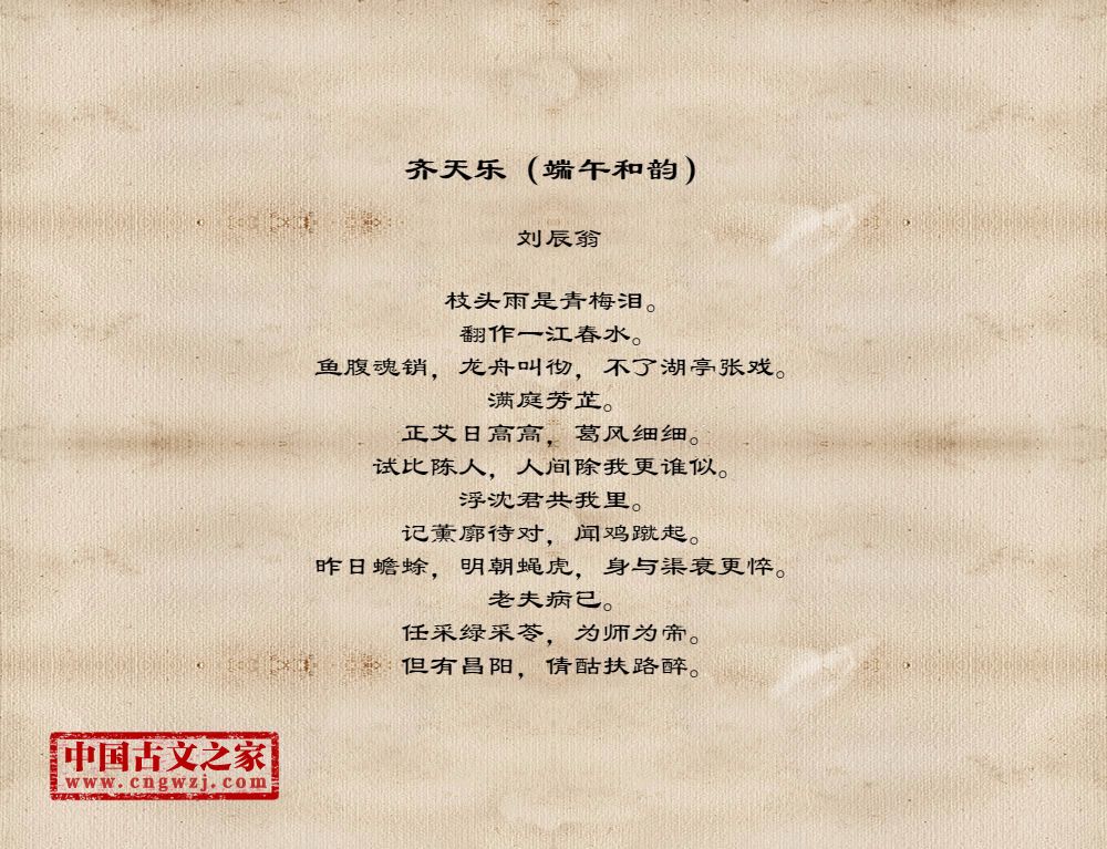 枝头雨是青梅泪。翻作一江春水。鱼腹魂销,龙舟叫彻,不了湖亭张戏。满庭芳芷。正艾日高高,葛风细细。试比陈人,人间除我更谁似。浮沈君共我里。记薰廓待对,闻鸡蹴起。昨日蟾蜍,明朝蝇虎,身与渠衰更悴。老夫病已。任采绿采苓,为师为帝。但有昌阳,倩酤扶路醉。