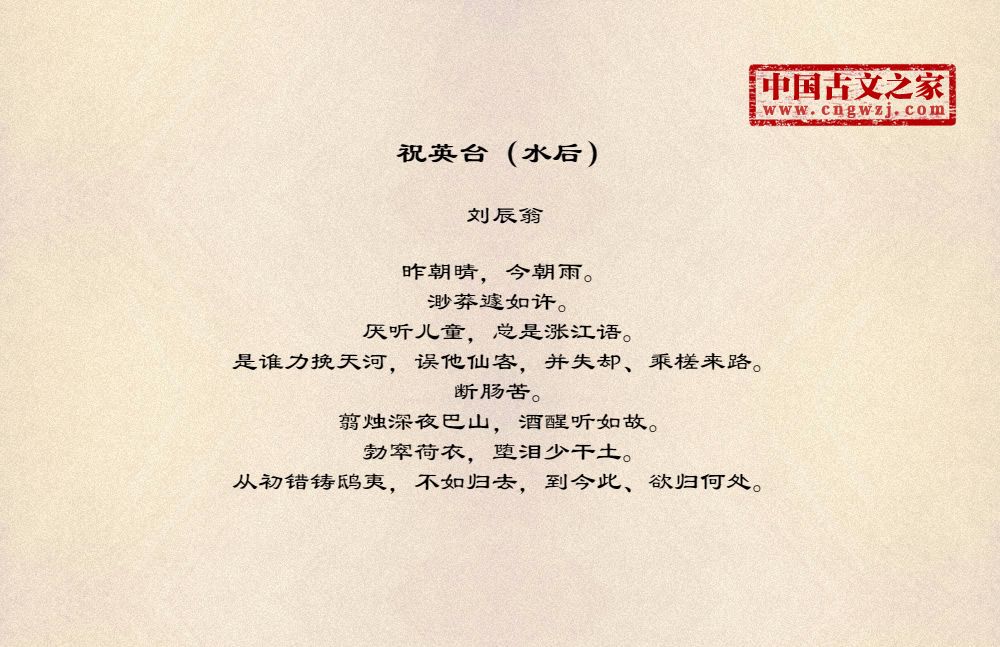 昨朝晴,今朝雨。渺莽遽如许。厌听儿童,总是涨江语。是谁力挽天河,误他仙客,并失却、乘槎来路。断肠苦。翦烛深夜巴山,酒醒听如故。勃窣荷衣,堕泪少干土。从初错铸鸱夷,不如归去,到今此、欲归何处。