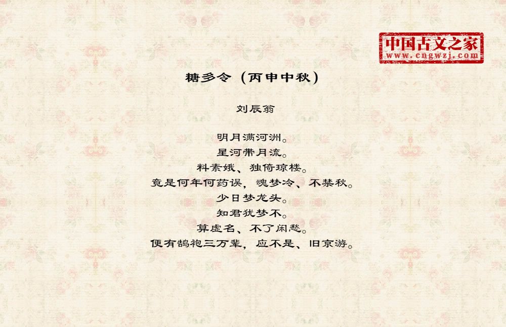 明月满河洲。星河带月流。料素娥、独倚琼楼。竟是何年何药误,魂梦冷、不禁秋。少日梦龙头。知君犹梦不。算虚名、不了闲愁。便有鹄袍三万辈,应不是、旧京游。