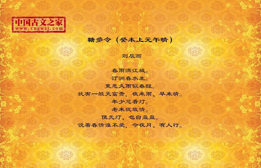 春雨满江城。汀洲春水生。更悲久雨似春酲。犹有一般天富贵,夜来雨、早来晴。年少总看灯。老来犹故情。便无灯、也自盈盈。说著春情谁不爱,今夜月、有人行。