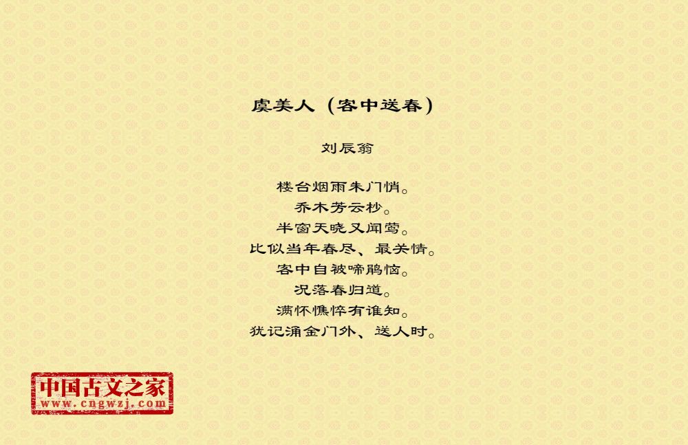 楼台烟雨朱门悄。乔木芳云杪。半窗天晓又闻莺。比似当年春尽、最关情。客中自被啼鹃恼。况落春归道。满怀憔悴有谁知。犹记涌金门外、送人时。