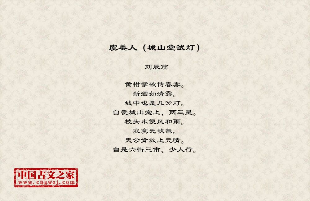 黄柑擘破传春雾。新酒如清露。城中也是几分灯。自爱城山堂上、两三星。枝头未便风和雨。寂寞无歌舞。天公肯放上元晴。自是六街三市、少人行。