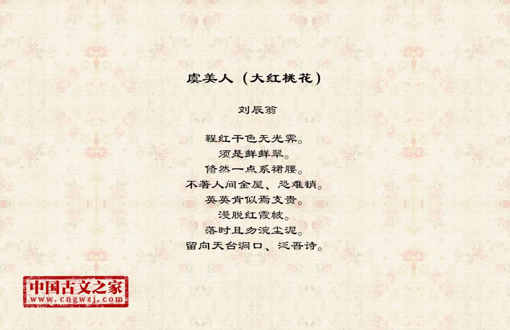 鞓红干色无光霁。须是鲜鲜翠。翛然一点系裙腰。不著人间金屋、恐难销。英英肯似焉支贵。漫脱红霞帔。落时且勿涴尘泥。留向天台洞口、泛吾诗。