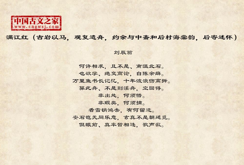 《满江红(古岩以马,观复遣舟,约余与中斋和后村海棠韵,后寄述怀)》的原文打印版(刘辰翁)