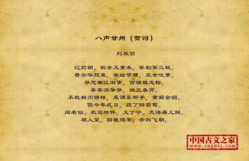 记前朝、鹤会又重来,攀翻第三桃。看云华授策,麻姑擘脯,嬴女吹箫。寻思曲江旧事,宫锦胜龙标。奏罢清华梦,独立春宵。不数相州锦样,是调羹御手,重解金貂。但今年此日,疏了醉葡萄。闻老仙、衣冠皓伟,又丁宁、天语著儿招。都人望,回班赐第,赤舄飞朝。