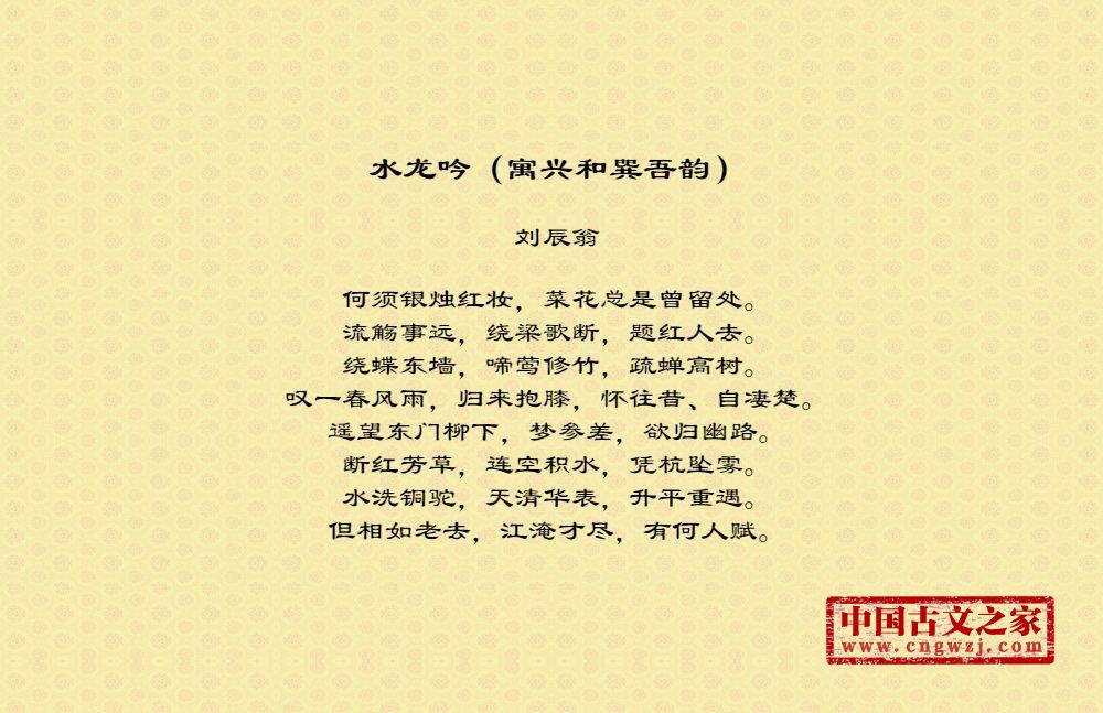 何须银烛红妆,菜花总是曾留处。流觞事远,绕梁歌断,题红人去。绕蝶东墙,啼莺修竹,疏蝉高树。叹一春风雨,归来抱膝,怀往昔、自凄楚。遥望东门柳下,梦参差,欲归幽路。断红芳草,连空积水,凭杭坠雾。水洗铜驼,天清华表,升平重遇。但相如老去,江淹才尽,有何人赋。