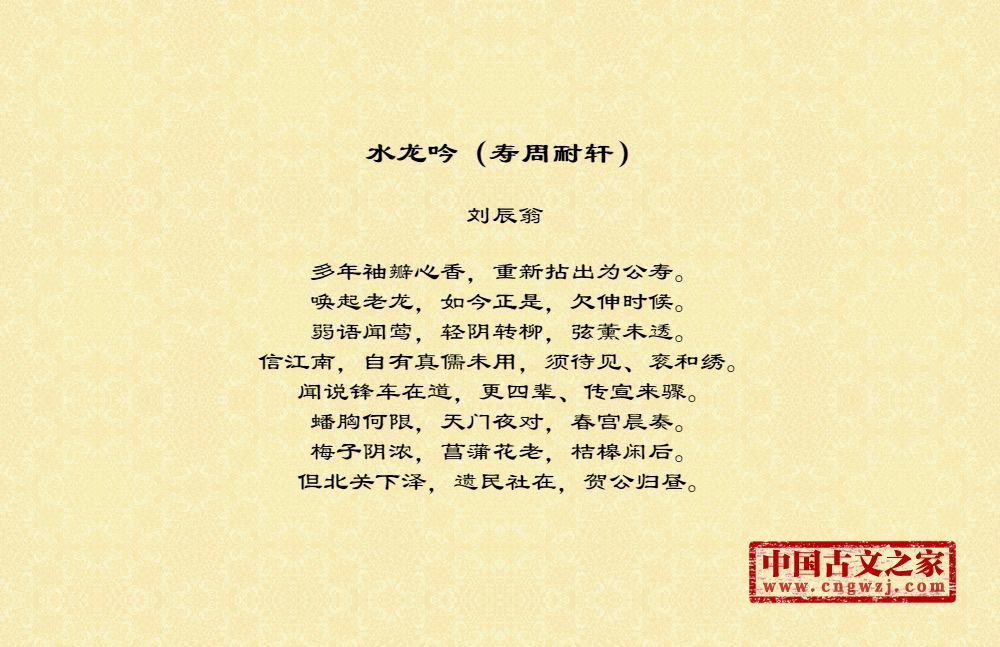 多年袖瓣心香,重新拈出为公寿。唤起老龙,如今正是,欠伸时候。弱语闻莺,轻阴转柳,弦薰未透。信江南,自有真儒未用,须待见、衮和绣。闻说锋车在道,更四辈、传宣来骤。蟠胸何限,天门夜对,春宫晨奏。梅子阴浓,菖蒲花老,桔槔闲后。但北关下泽,遗民社在,贺公归昼。