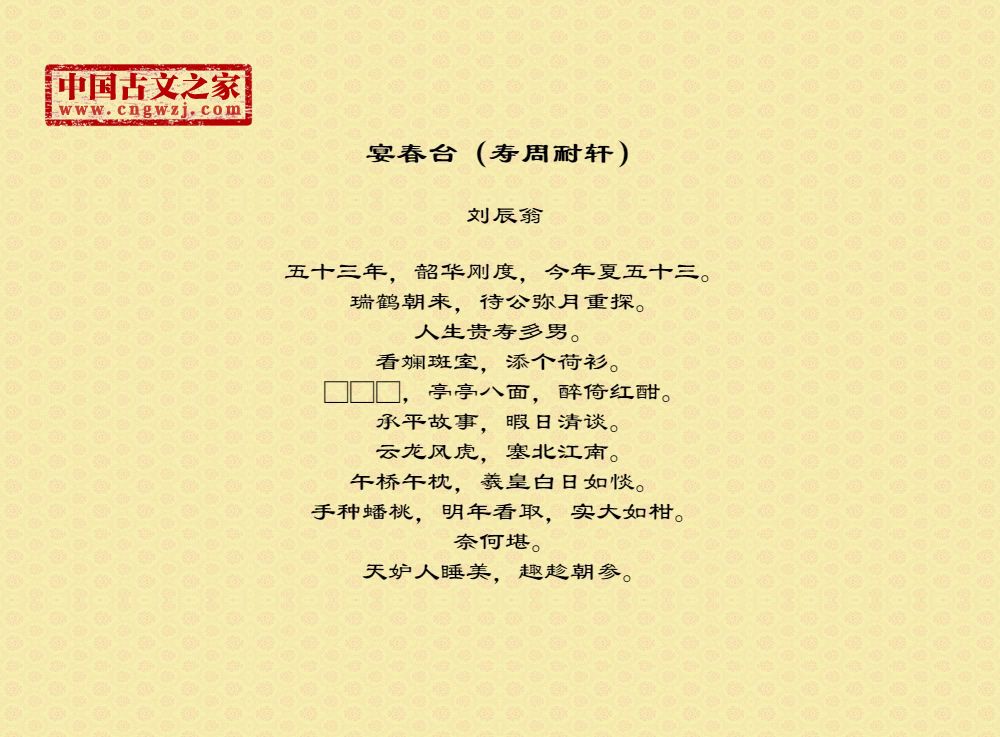 五十三年,韶华刚度,今年夏五十三。瑞鹤朝来,待公弥月重探。人生贵寿多男。看斓斑室,添个荷衫。□□□,亭亭八面,醉倚红酣。承平故事,暇日清谈。云龙风虎,塞北江南。午桥午枕,羲皇白日如惔。手种蟠桃,明年看取,实大如柑。奈何堪。天妒人睡美,趣趁朝参。