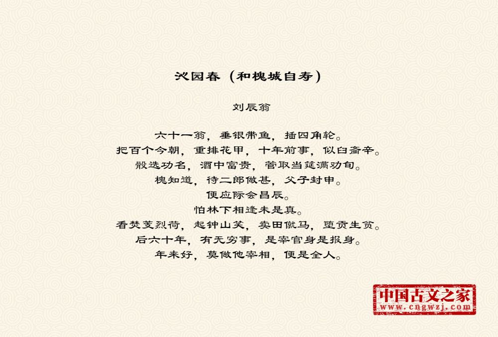 六十一翁,垂银带鱼,插四角轮。把百个今朝,重排花甲,十年前事,似臼齑辛。骰选功名,酒中富贵,管取当筵满劝旬。槐知道,待二郎做甚,父子封申。便应际会昌辰。怕林下相逢未是真。看焚芰烈荷,起钟山笑,卖田僦马,堕贡生贫。后六十年,有无穷事,是宰官身是报身。年来好,莫做他宰相,便是全人。