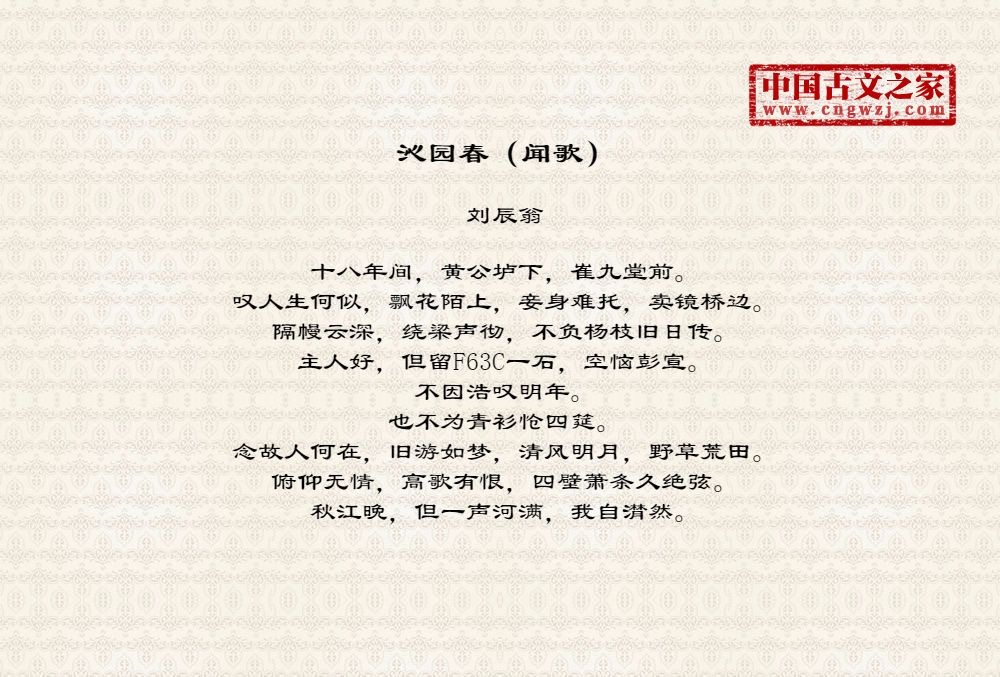 十八年间,黄公垆下,崔九堂前。叹人生何似,飘花陌上,妾身难托,卖镜桥边。隔幔云深,绕梁声彻,不负杨枝旧日传。主人好,但留F63C一石,空恼彭宣。不因浩叹明年。也不为青衫怆四筵。念故人何在,旧游如梦,清风明月,野草荒田。俯仰无情,高歌有恨,四壁萧条久绝弦。秋江晚,但一声河满,我自潸然。
