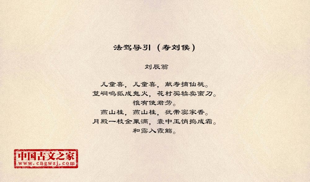 儿童喜,儿童喜,献寿摘仙桃。篁峒鸣狐成鬼火,花村买犊卖蛮刀。惟有使君劳。燕山桂,燕山桂,犹带窦家香。月殿一枝金粟满,囊中玉悄捣成霜。和露入霞觞。