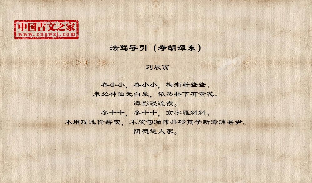 春小小,春小小,梅渐著些些。未必神仙无白发,依然林下有黄花。潭影浸流霞。冬十十,冬十十,亥字雁斜斜。不用瑶池偷碧实,不须句漏博丹砂其子新漳浦县尹。阴德遍人家。
