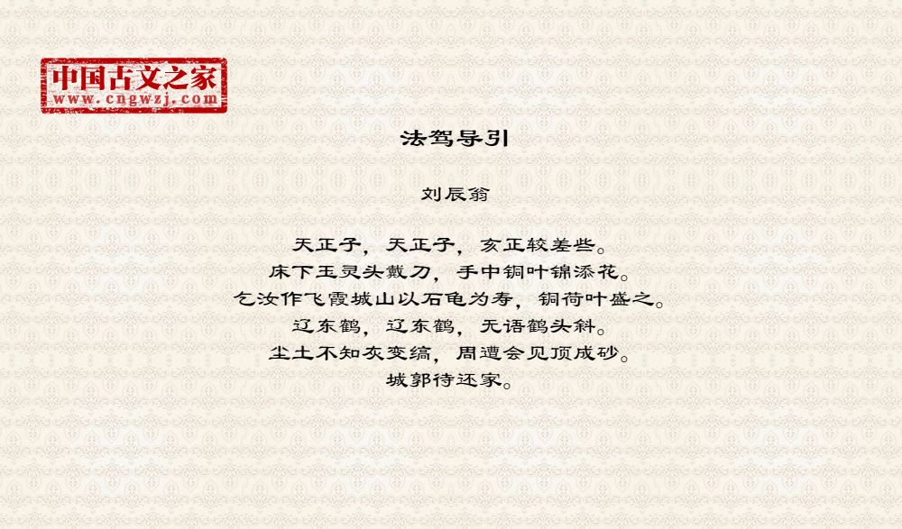 天正子,天正子,亥正较差些。床下玉灵头戴刀,手中铜叶锦添花。乞汝作飞霞城山以石龟为寿,铜荷叶盛之。辽东鹤,辽东鹤,无语鹤头斜。尘土不知灰变缟,周遭会见顶成砂。城郭待还家。