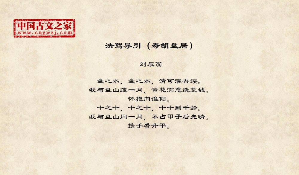 盘之水,盘之水,清可濯吾缨。我与盘山疏一月,黄花满意绕荒城。怀抱向谁倾。十之十,十之十,十十到千龄。我与盘山同一月,不占甲子后先晴。携手看升平。