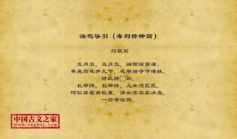 五月五,五月五,细雨绿菖蒲。早是高花开九节,花堪结子节堪扶。持此揆□初。长命缕,长命缕,儿女漫区区。何似屏星南极里,清如寒露在冰壶。一府号仙儒。