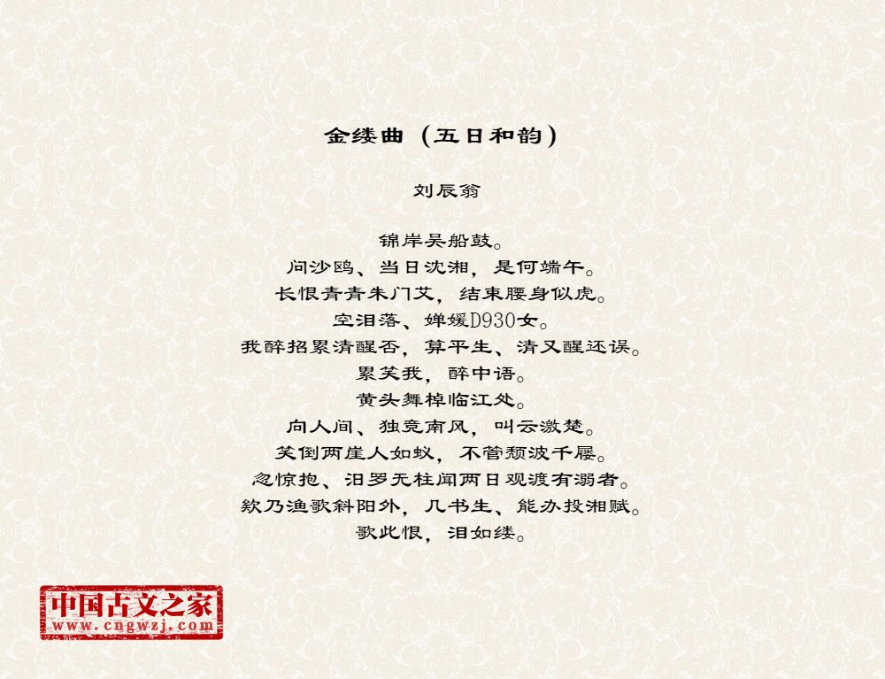 锦岸吴船鼓。问沙鸥、当日沈湘,是何端午。长恨青青朱门艾,结束腰身似虎。空泪落、婵媛D930女。我醉招累清醒否,算平生、清又醒还误。累笑我,醉中语。黄头舞棹临江处。向人间、独竞南风,叫云激楚。笑倒两崖人如蚁,不管颓波千屦。忽惊抱、汨罗无柱闻两日观渡有溺者。欸乃渔歌斜阳外,几书生、能办投湘赋。歌此恨,泪如缕。