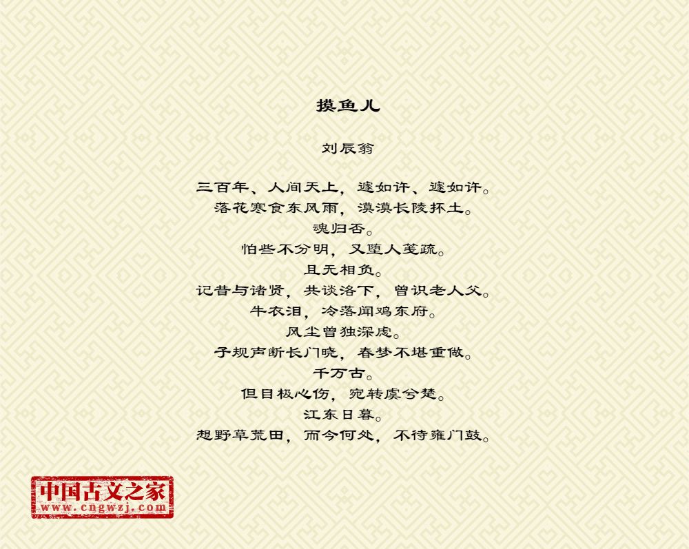 三百年、人间天上,遽如许、遽如许。落花寒食东风雨,漠漠长陵抔土。魂归否。怕些不分明,又堕人笺疏。且无相负。记昔与诸贤,共谈洛下,曾识老人父。牛衣泪,冷落闻鸡东府。风尘曾独深虑。子规声断长门晓,春梦不堪重做。千万古。但目极心伤,宛转虞兮楚。江东日暮。想野草荒田,而今何处,不待雍门鼓。