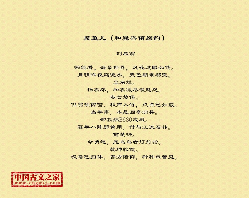 懒能看、海桑世界,风花过眼如传。月明昨夜庭流水,天色朝来都变。尘石烂。铢衣坏,和衣减尽谁能怨。秦亡楚倦。但翦烛西窗,秋声入竹,点点已如霰。当年事,本是泗亭沛县。却教绵B630成殿。暮年八阵那曾用,付与江流石转。前楚辩。今哨遍,是乌乌者灯前劝。乾坤较健。叹君已归休,吾方俯仰,种种未曾见。