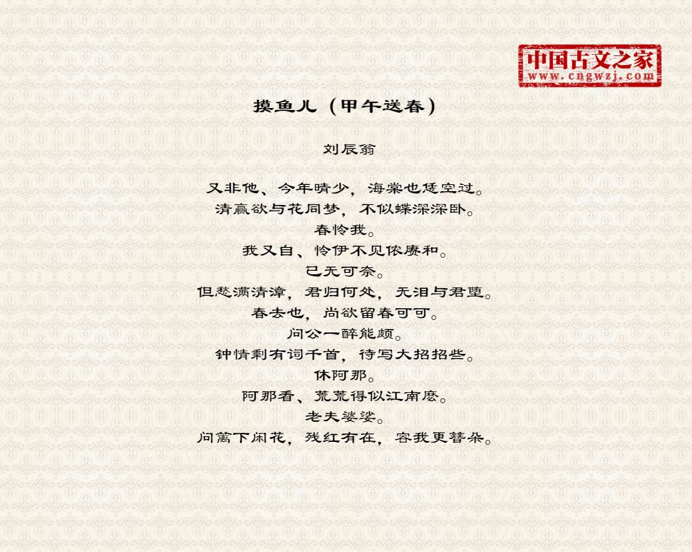 又非他、今年晴少,海棠也恁空过。清赢欲与花同梦,不似蝶深深卧。春怜我。我又自、怜伊不见侬赓和。已无可奈。但愁满清漳,君归何处,无泪与君堕。春去也,尚欲留春可可。问公一醉能颇。钟情剩有词千首,待写大招招些。休阿那。阿那看、荒荒得似江南麽。老夫婆娑。问篱下闲花,残红有在,容我更簪朵。
