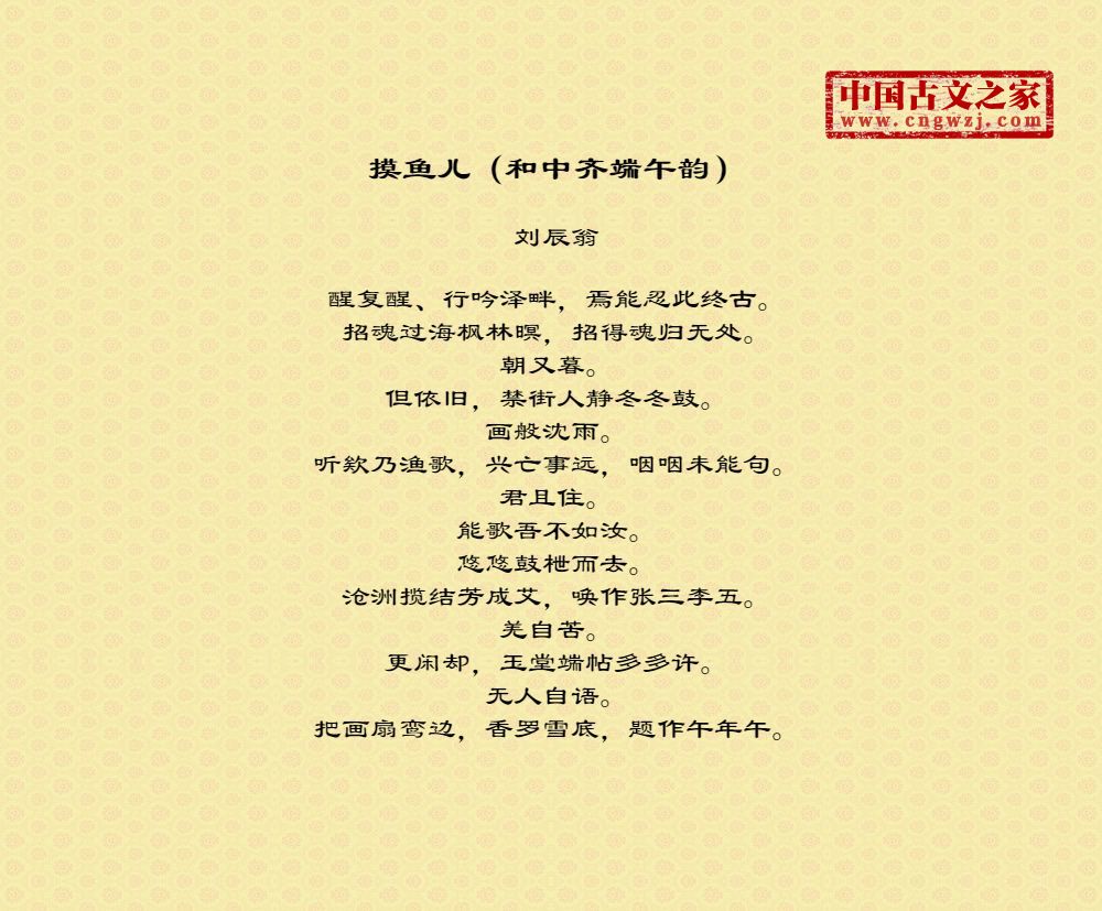 醒复醒、行吟泽畔,焉能忍此终古。招魂过海枫林暝,招得魂归无处。朝又暮。但依旧,禁街人静冬冬鼓。画般沈雨。听欸乃渔歌,兴亡事远,咽咽未能句。君且住。能歌吾不如汝。悠悠鼓枻而去。沧洲揽结芳成艾,唤作张三李五。羌自苦。更闲却,玉堂端帖多多许。无人自语。把画扇鸾边,香罗雪底,题作午年午。