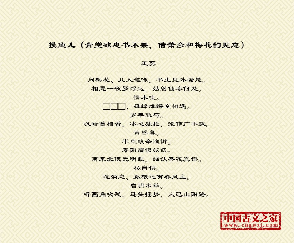 《摸鱼儿(肯堂欲惠书不果,借萧彦和梅花韵见意)》的原文打印版(王奕)