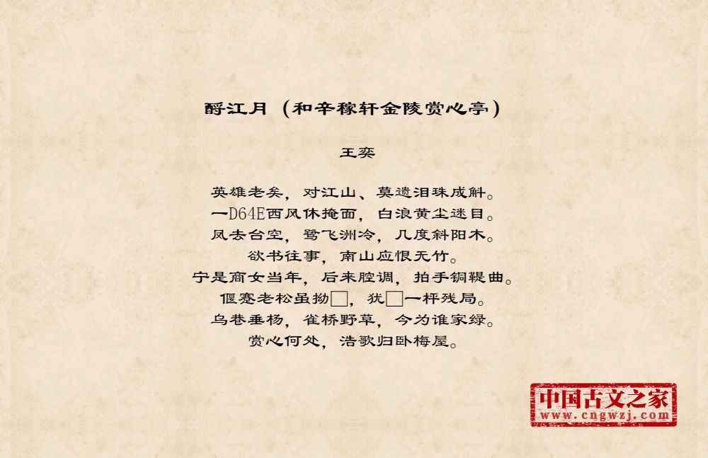 《酹江月(和辛稼轩金陵赏心亭)》的原文打印版(王奕)