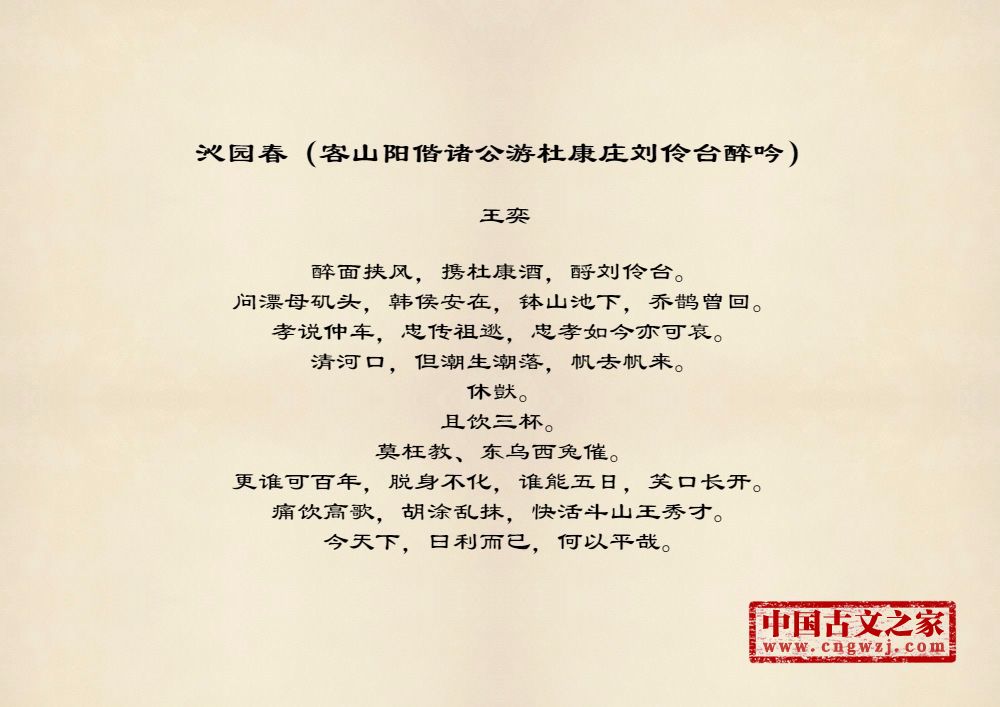 《沁园春(客山阳偕诸公游杜康庄刘伶台醉吟)》由王奕创作