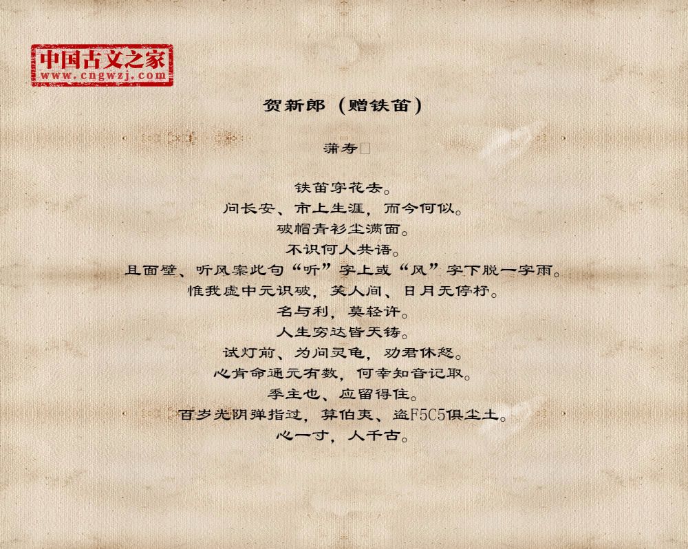 铁笛穿花去。问长安、市上生涯,而今何似。破帽青衫尘满面。不识何人共语。且面壁、听风案此句“听”字上或“风”字下脱一字雨。惟我虚中元识破,笑人间、日月无停杼。名与利,莫轻许。人生穷达皆天铸。试灯前、为问灵龟,劝君休怒。心肯命通元有数,何幸知音记取。季主也、应留得住。百岁光阴弹指过,算伯夷、盗F5C5俱尘土。心一寸,人千古。