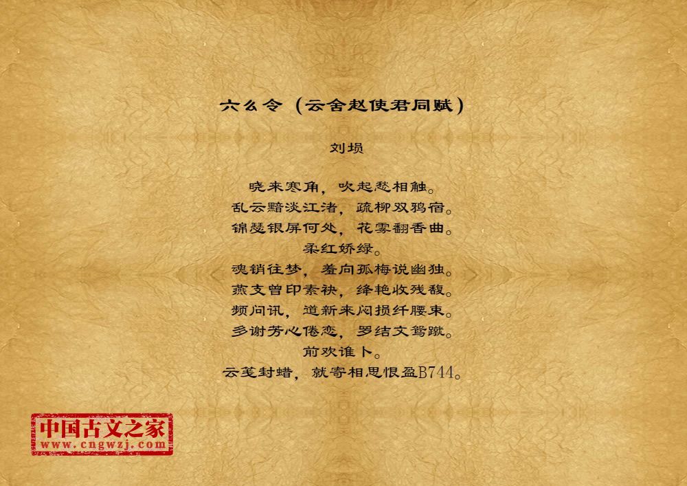 晓来寒角,吹起愁相触。乱云黯淡江渚,疏柳双鸦宿。锦瑟银屏何处,花雾翻香曲。柔红娇绿。魂销往梦,羞向孤梅说幽独。燕支曾印素袂,绛艳收残馥。频问讯,道新来闷损纤腰束。多谢芳心倦恋,罗结文鸳蹴。前欢谁卜。云笺封蜡,就寄相思恨盈B744。